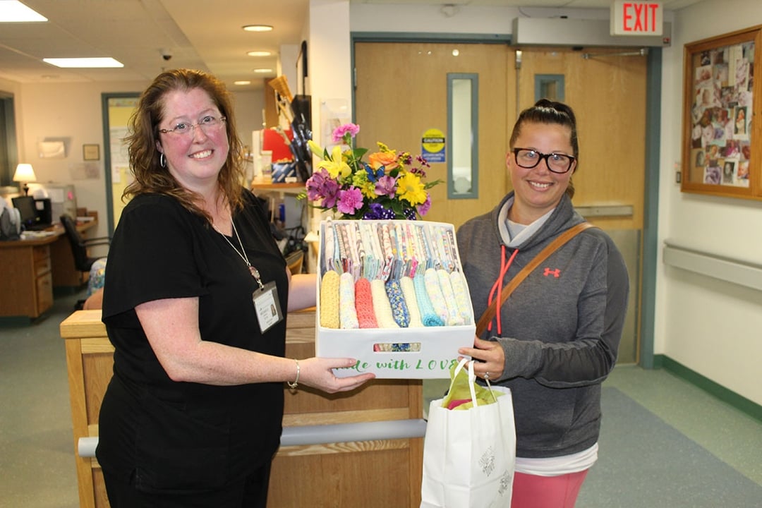 After that, Nicole went to work crocheting hats and blankets, and sewing more blankets, to be used in similar circumstances. She donated all the time she spent crocheting from January through March. She ended up creating a box full of them, which she brought to Adirondack Medical Center to donate this spring.
